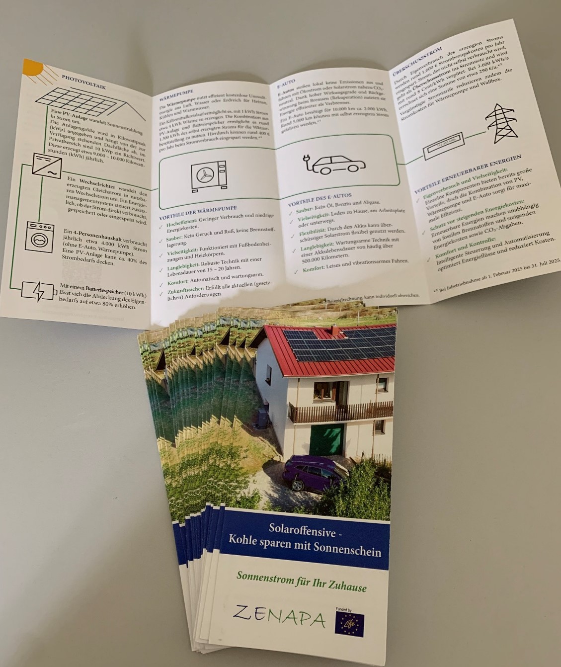 Zum Auftakt wurde der Informationsflyer „Sonnenstrom für Ihr Zuhause“ erstellt, der bereits in vielen ZENAPA-Regionen verteilt wird. Darüber hinaus wird er im Rahmen der größten Postmailingaktion des ZENAPA-Projektes in den kommenden Wochen rund 120.000 Haushalte erreichen. Ferner erfolgt die Ansprache über Amtsblätter, Landkreisjournalen und via Social-Media durch die Projektpartner. Ergänzend dazu informierten wir auf unseren Social-Media-Kanälen Facebook und Instagram über die wichtigsten Fakten und Zusammenhänge rund um das Thema – anschaulich und kompakt. Insgesamt sollen so 440.000 Personen in den Projektregionen erreicht werden.