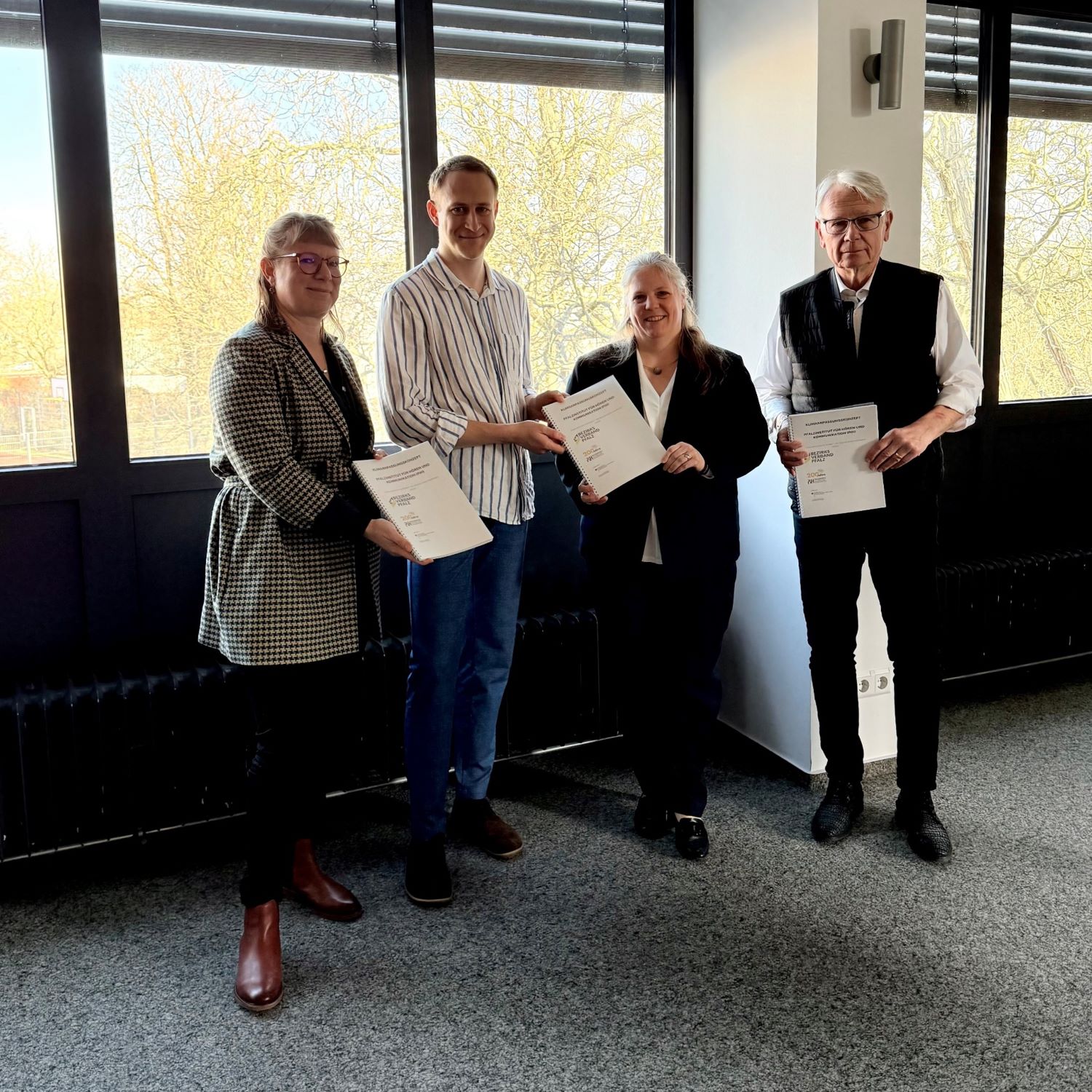 Übergabe des Konzepts (v.l.n.r.): Carolin Sperk (Klimaschutz- und Klimaanpassungsmanagerin des Bezirksverbands Pfalz), Max Ulrich (Geschäftsführer AtmoVera), Sarah Romanski (stellvertrende Schulrektorin) und Dr. Klaus Weichel (erster stellvertretender Bezirkstagsvorsitzender). © Bezirksverband Pfalz